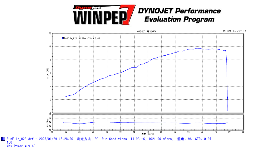 アクセル開度100パーセントで後軸9.68PS・レブ9500rpmに設定